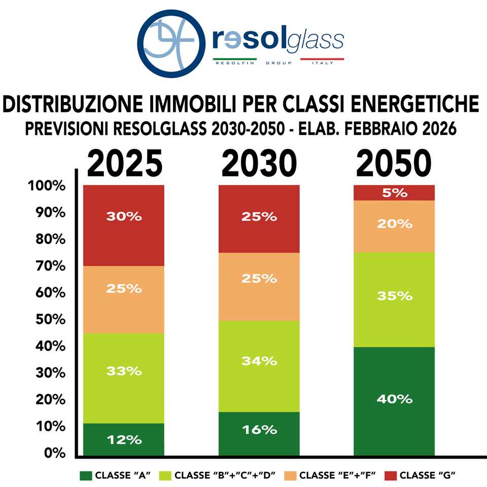 Secondo le «Previsioni 2030-2050 di Resolglass» in merito alla distribuzione in Italia degli immobili per classi energetiche, nel 2050 gli immobili in classe “A” dall’attuale 12% saliranno al 40%, mentre quelli in classe “G” scenderanno al 5% (1/6 rispetto al dato del 2025).